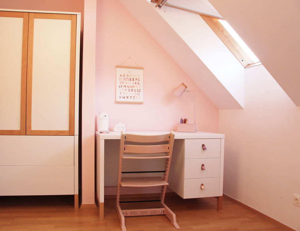 Amikor Flóra iskolás lett, időszerűvé vált, hogy átalakítsák a gyerekszobáját. A bútorokat, amiket kicsi korában kapott ő és a szülei is nagyon szerették, nem szívesen váltak volna meg tőlük. A meglévő komód tetejére rátettük a ruhásszekrényt, hogy egy nagylánynak is jó legyen. Flórának új íróasztalt és könyvszekrényt terveztünk, amelyek stílusukban tökéletesen passzolnak a régi bútorokhoz. A bőrből készült színes fogantyúk még több színt és vidámságot visznek a gyerekszobába. Letisztult formaviláguknak köszönhetően ezeket a bútorokat Flóra egészen nagy koráig kihasználhatja majd.