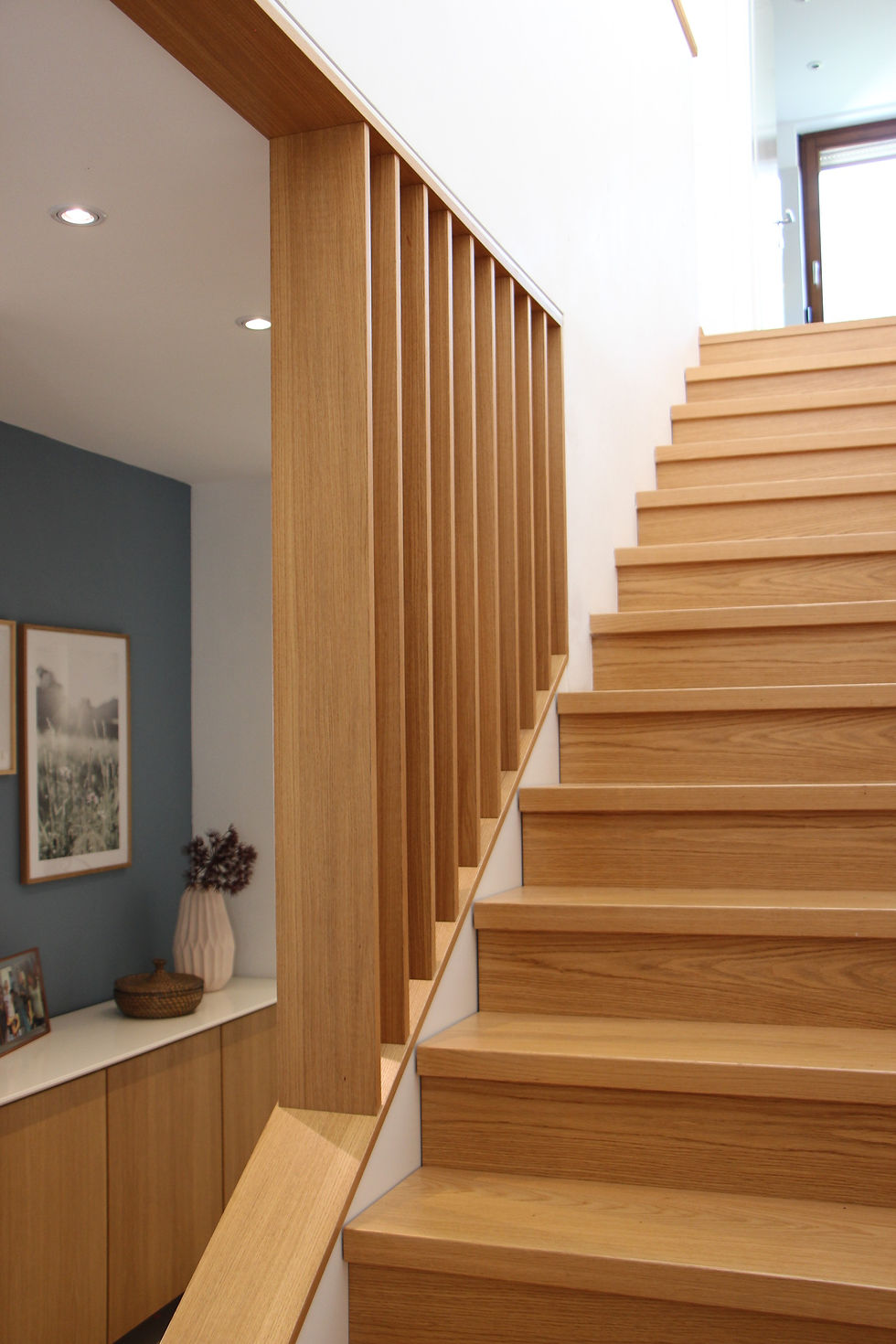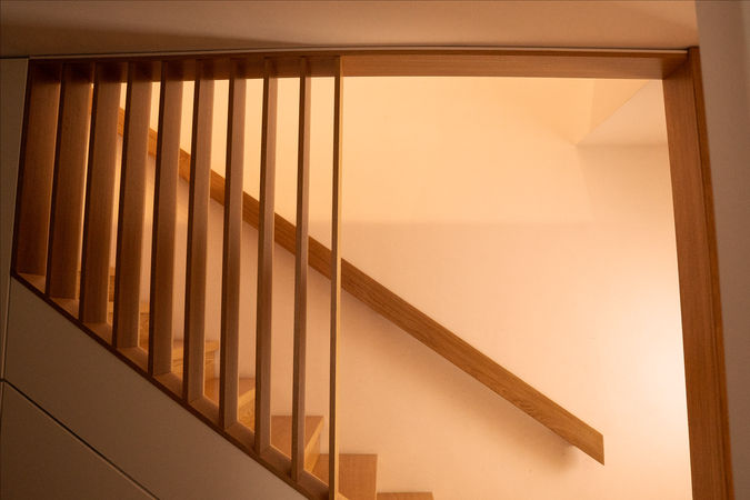 A családi ház ebédlőjében található lépcső tervezésénél kiemelt szempont volt, hogy harmonikusan illeszkedjen a meglévő enteriőrbe, miközben több funkcionális igényt is kielégít. A tölgyfából készült függőleges lamellák esztétikus megjelenésük mellett védelmet nyújtanak a leesés ellen, ugyanakkor lehetővé teszik a fény szabad áramlását a földszinti folyosóra.