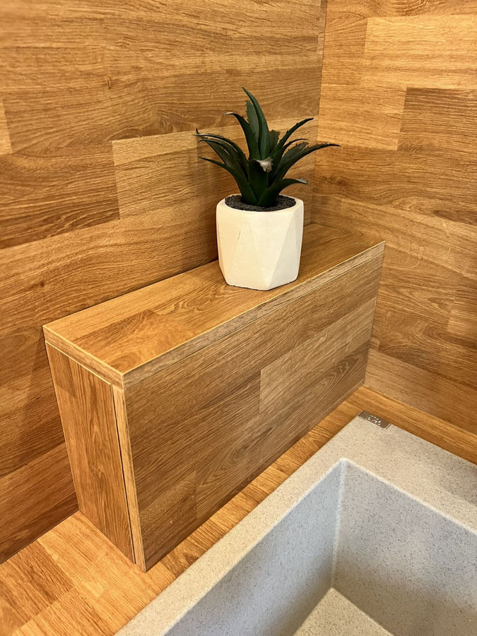 A tér hatékony kihasználása ezért kiemelt szerepet kapott a tervezés során. A felsőszekrényeket a plafonig terveztük, ezzel maximalizálva a tárolókapacitást. Az optikai térérzet növelése érdekében a felső két sor világos színt kapott, így a konyha világosabbnak és tágasabbnak hat. A pult alá egy kihúzható, rejtett munkalapot is beépítettünk, amely szükség esetén további munkafelületet biztosít a közös főzéshez.